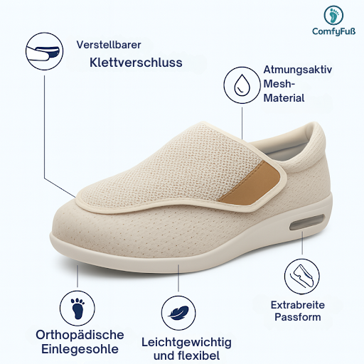 Jedes Detail hat eine Funktion. Vom atmungsaktiven Mesh, das Ihre Füße kühl hält, bis zum verstellbaren Verschluss, der sich an Schwellungen anpasst – ComfyFuẞ™ bietet Linderung, ohne auf Komfort oder Stil zu verzichten.